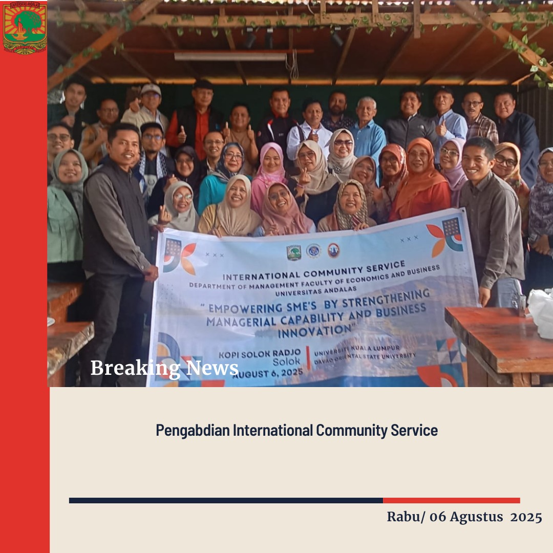 Solok, 6 Agustus 2025 — Fakultas Ekonomi dan Bisnis Universitas Andalas (FEB Unand) bersama Universiti Kuala Lumpur (UniKL) melaksanakan kegiatan International Community Service bertajuk “Empowering SMEs by Strengthening Managerial Capability and Business Innovation” pada hari Rabu, 6 Agustus 2025, bertempat di Kopi Solok Radjo, Kabupaten Solok.