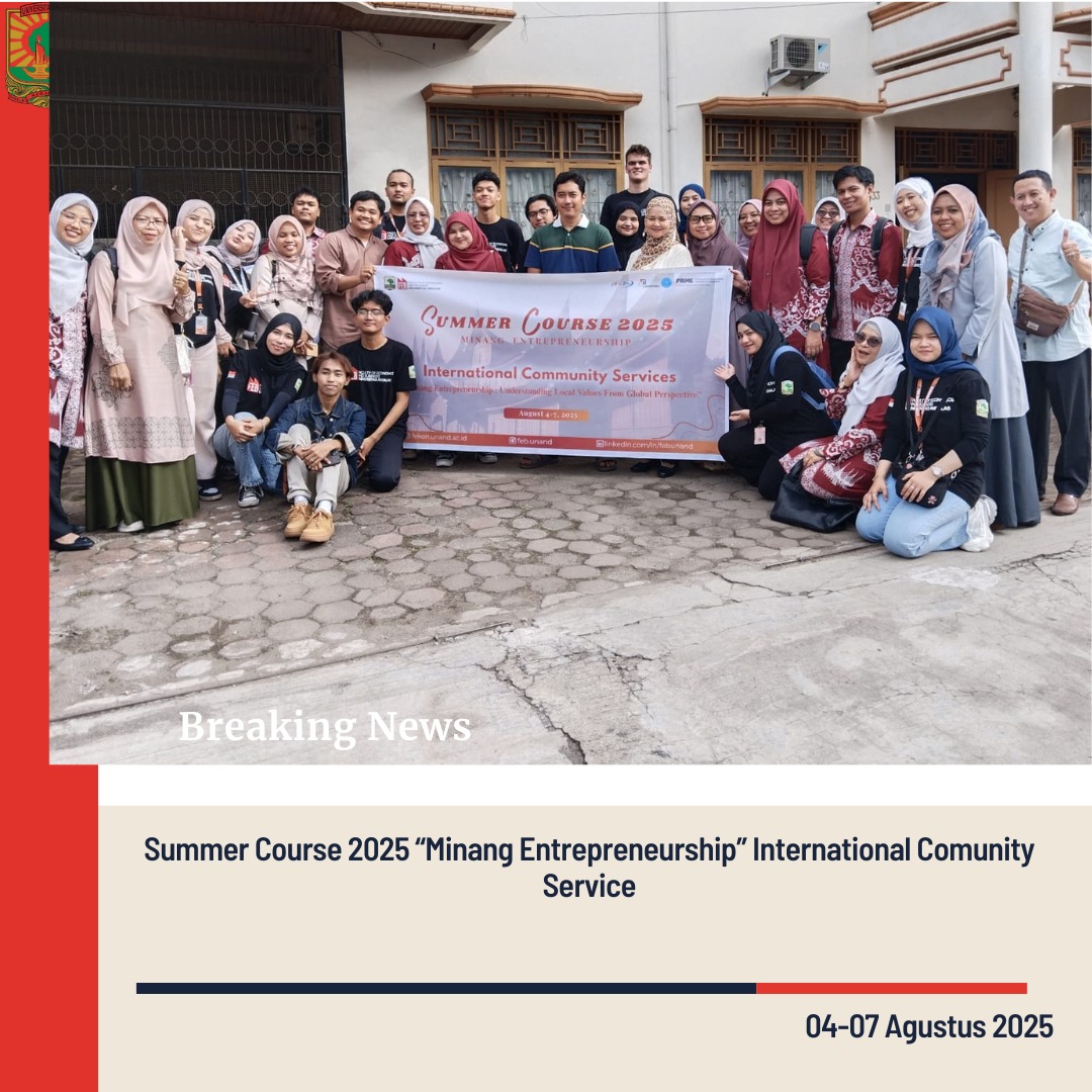 Padang, 7 Agustus 2025 – Fakultas Ekonomi dan Bisnis Universitas Andalas sukses menyelenggarakan kegiatan Summer Course 2025 dengan tema “Minang Entrepreneurship” pada tanggal 04–07 Agustus 2025. Kegiatan ini merupakan bagian dari program International Community Service, yang bertujuan memperkenalkan konsep kewirausahaan berbasis budaya lokal Minangkabau kepada peserta dari berbagai universitas, baik dalam maupun luar negeri.