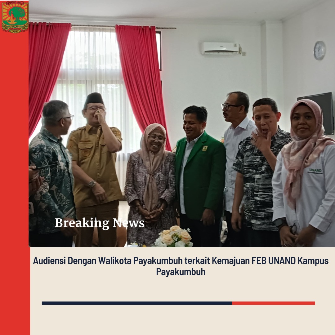 Fakultas Ekonomi dan Bisnis Universitas Andalas (FEB UNAND) Kampus Payakumbuh melakukan audiensi dengan Wali Kota Payakumbuh dalam rangka memperkuat sinergi antara dunia akademik dan pemerintah daerah. Kegiatan ini bertujuan untuk membahas peluang kolaborasi strategis dalam mendukung pengembangan pendidikan tinggi, penelitian, dan pengabdian kepada masyarakat di wilayah Kota Payakumbuh.