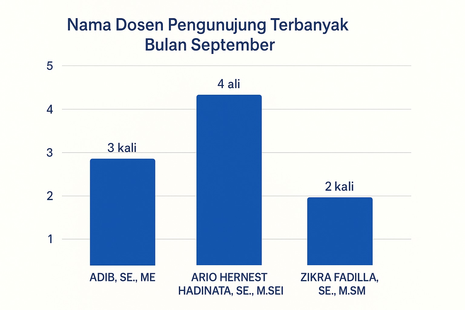 Sementara itu, dari kalangan dosen, Ario Hernest Hadinata, SE., M.SEI menjadi pengunjung aktif dengan 4 kali kunjungan, diikuti oleh Adib, SE., ME dan Zikra Fadilla, SE., M.SM.