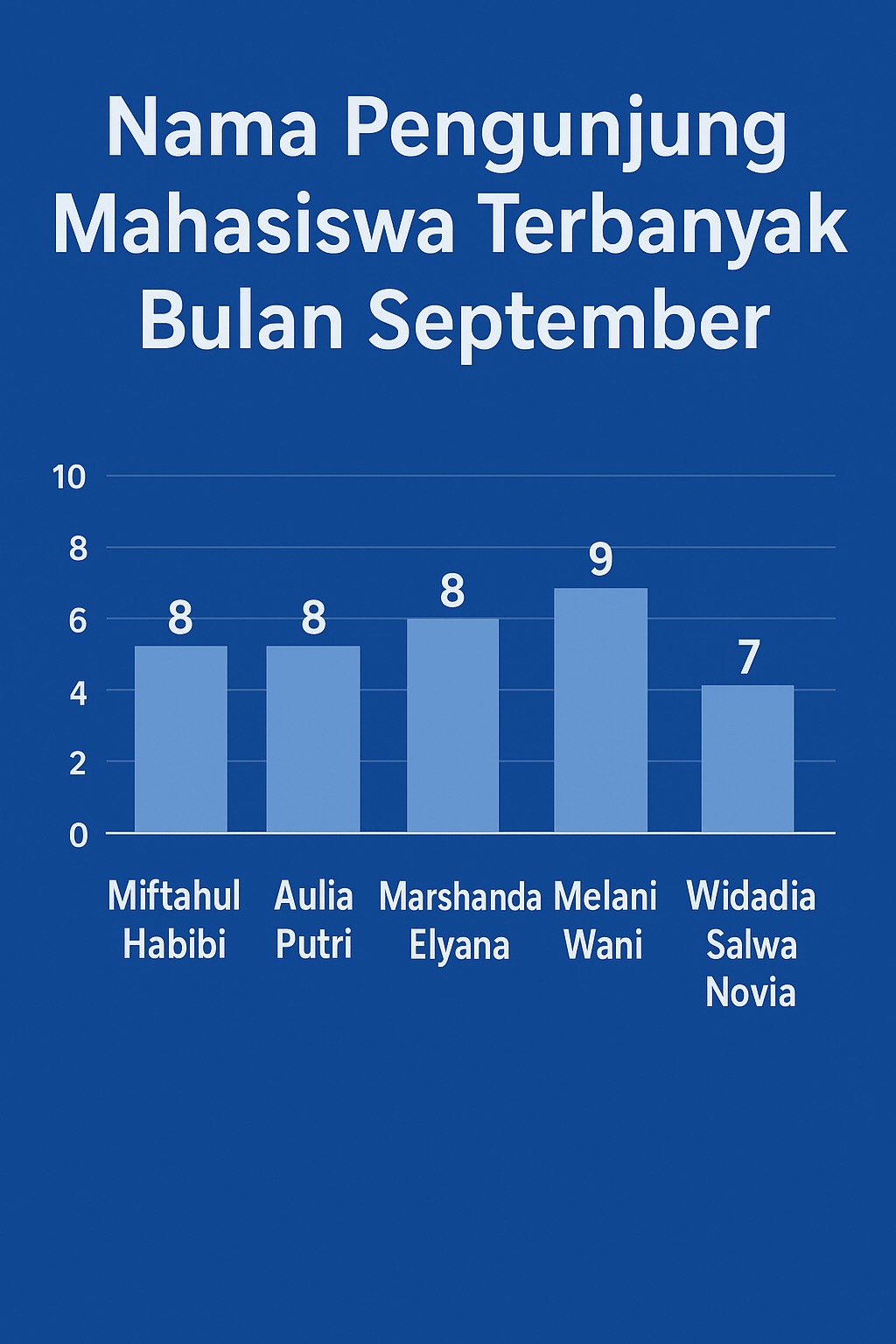 Berdasarkan data rekapitulasi, beberapa mahasiswa tercatat sebagai pengunjung terbanyak bulan September, antara lain Melani Wani, dengan 9 kali kunjungan, disusul oleh Miftahul Habibi dan Aulia Putri Marsyanda Elyana dengan 8 kali kunjungan.